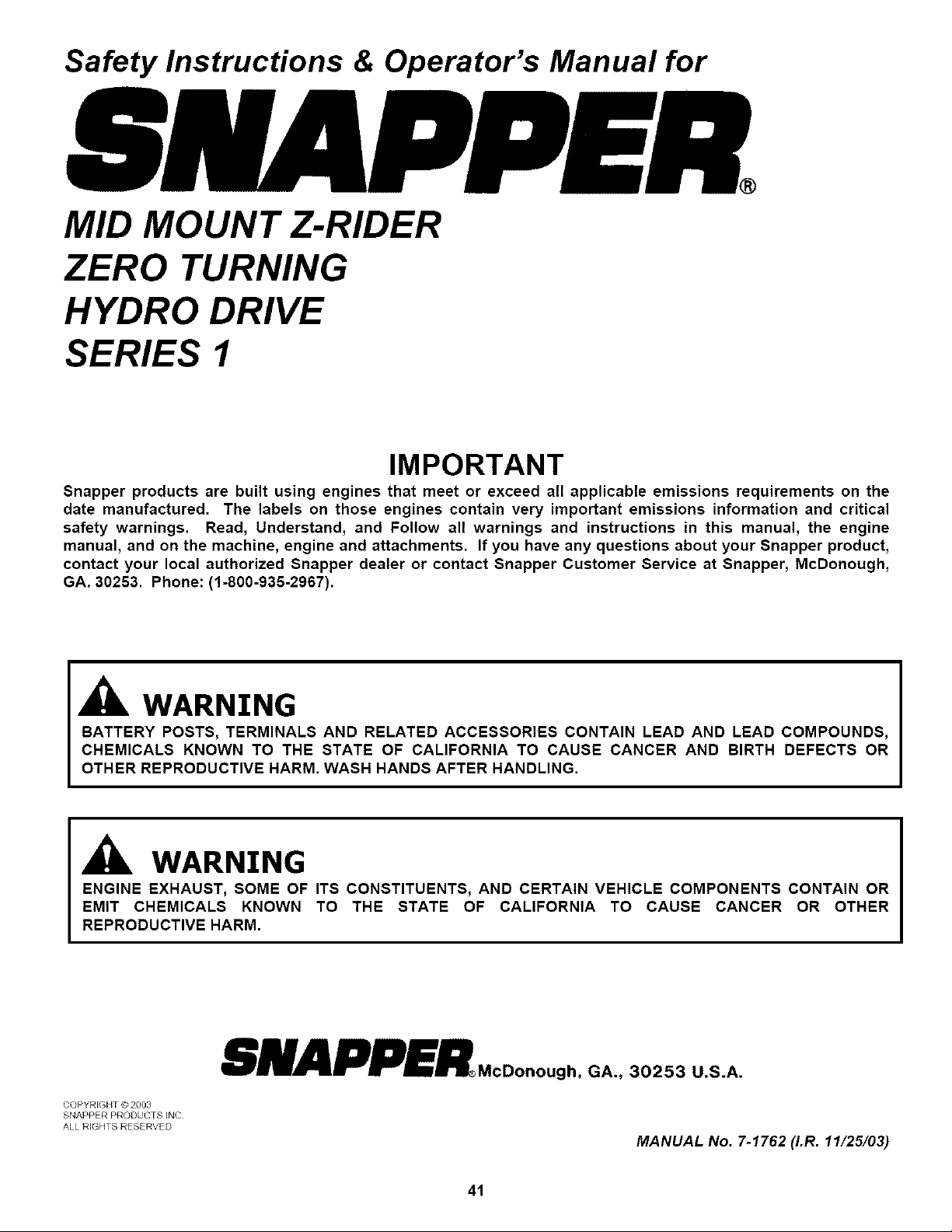 manual, and on the machine, engine and attachments. If you have any questions about your Snapper product,
