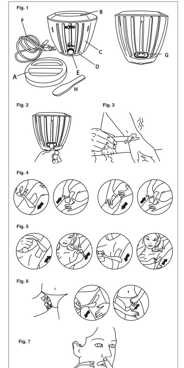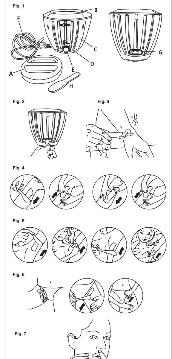 a absorb any moisture, especially on bikini and underarms. ve not waxed before, we recommend starting by removing hair from the legs. Only when you have be then progress to the sensitive areas of underarm and bikini line. We recommend to not wax the a of skin twice during a waxing session. ie pot on a flat surface t the cable and plug in the appliance to the mains (Fig.2) bid and pour the capsules of way into the pot Place the ody area you wish to depilate into the pot and replace the lid. The cool wax capacity is 150 gr. The melting wax capacity is 250 gr ch on the appliance to wax melting. The pot will light up, to indicate it is powered and heating. he wax now and again with the spatula. wax is ready to use when it achieves ana again with the spatula. r to use when it achieves a smooth, liquid consistency. This process will take approxi nutes (if melting 4 discs). The pot is designed to melt and keep the wax at the idea the wax to ensure an even temperature throughout. Ing the spatula place a little wax on the back of your hand to test the temperature. If this is suitable for you may begin hair removal. (Fig. 3) sanks to the thermostat, the temperature of the your hand to test the temperature. If this is suitable for Thanks to the thermostat, the temperature of the wax will remain constant. 1 your hand along your skin using an upward motion to flatten out the heire sying the wax ys be applied in the opposite direction to the growth of the hair. spatula to avoid drips and threads whilst transferring to your leg.