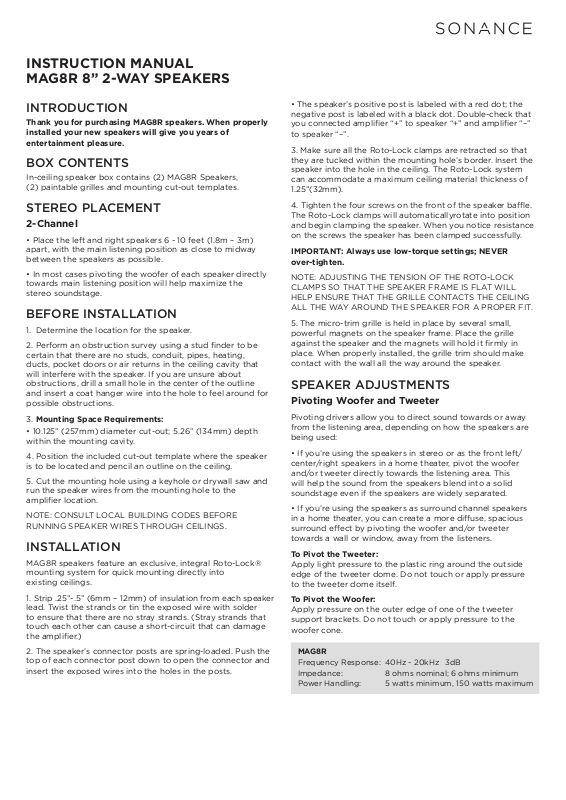 For the latest Sonance product specification information visit our website: www.sonance.com.
