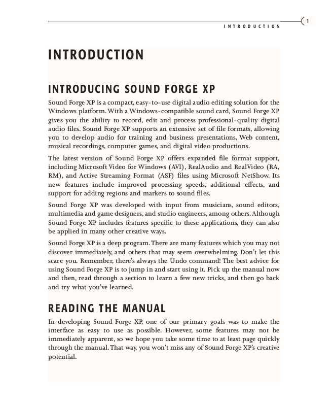 The Introduction briefly describes Sound Forge XP, includes installation,
