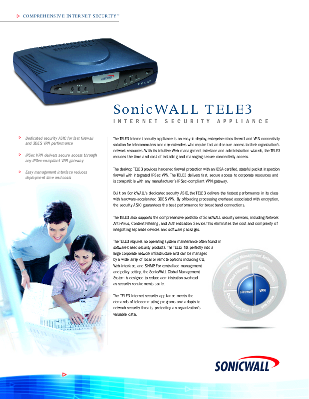Built on SonicWALL's dedicated security A S I C , the TELE3 delivers the fastest performance in its class