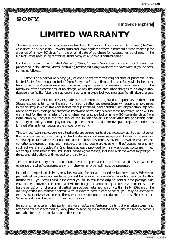 purchased in the United States (excluding territories). Sony warrants the hardware of your Accessories as follows: