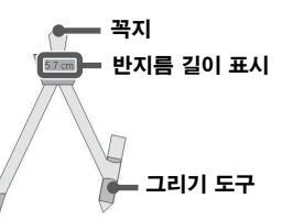 분할기 도구를 사용하여 원호나 부채꼴 을 그릴 수 있습니다. 분할기를 이동하 려면 분할기 꼭지 또는 왼쪽 접지부를 클릭한 상태로 분할기를 다음 위치로 이동합니다. 반지름을 변경하려면 분 할기 오른쪽 접지부를 클릭한 상태로 왼쪽 또는 오른쪽으로 수평으로 이동합 니다. 분할기에 새 반지름 길이가 표시 됩니다. 원호나 부채꼴을 그리려면 분