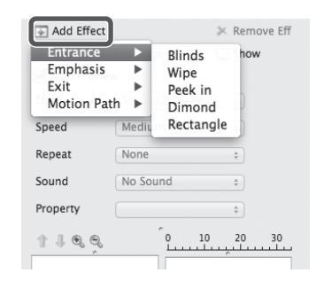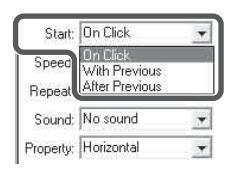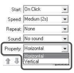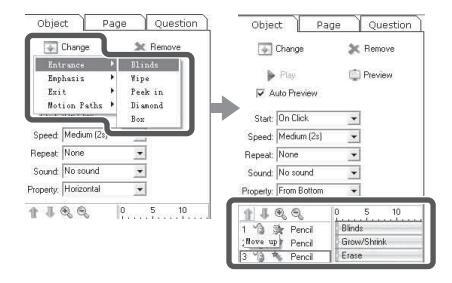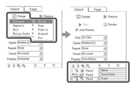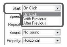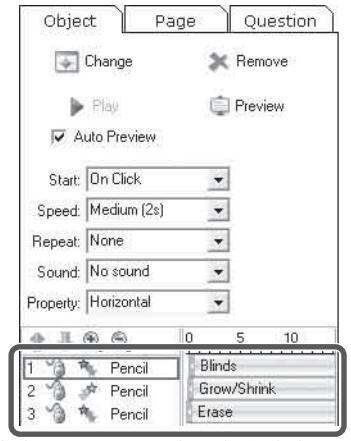 재생 순서를 변경하려면 애니메이션 개채 목록에서 개체를 선택한 다음 "위로 이동" ¶ 또는 "아래로 이동" ↓을 클릭합니다.