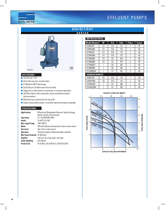 Applications: Effluent and Wastewater Removal, Sump Drainage,