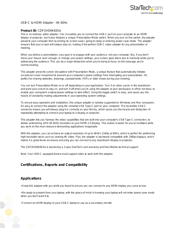 The CDP2HD4K60SA is backed by a 3-year StarTech.com warranty and free lifetime technical support.