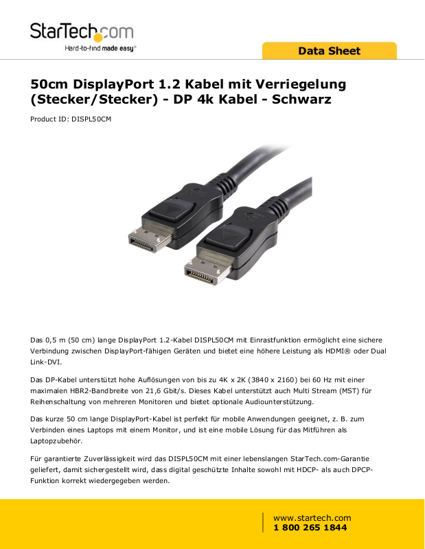 Das 0,5 m (50 cm) lange DisplayPort 1.2-Kabel DISPL50CM mit Einrastfunktion ermöglicht eine sichere
