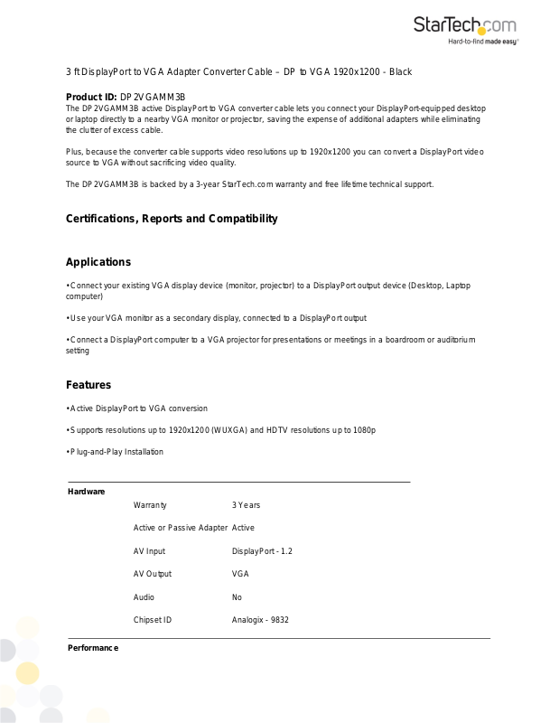 The DP2VGAMM3B is backed by a 3-year StarTech.com warranty and free lifetime technical support.