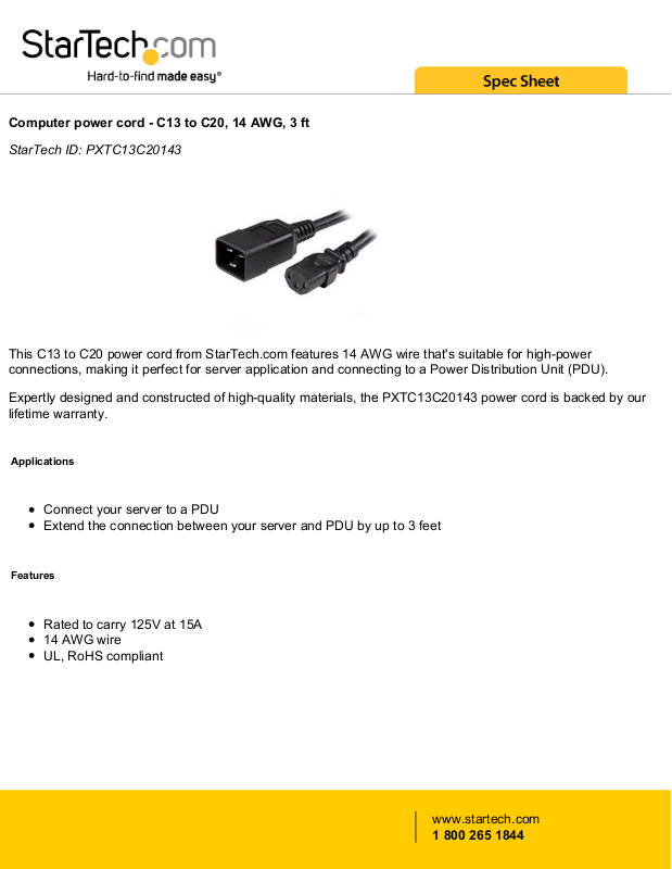 This C13 to C20 power cord from StarTech.com features 14 AWG wire that's suitable for high-power