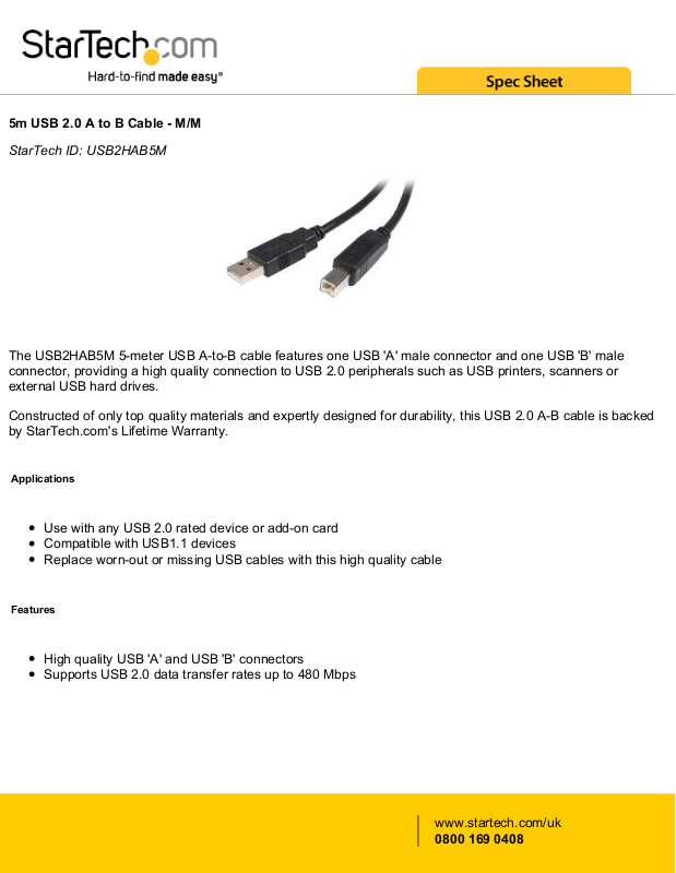 Constructed of only top quality materials and expertly designed for durability, this USB 2.0 A-B cable is backed