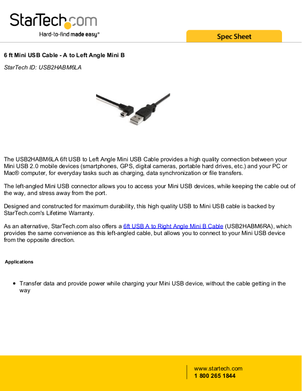 As an alternative, StarTech.com also offers a 6ft USB A to Right Angle Mini B Cable (USB2HABM6RA), which