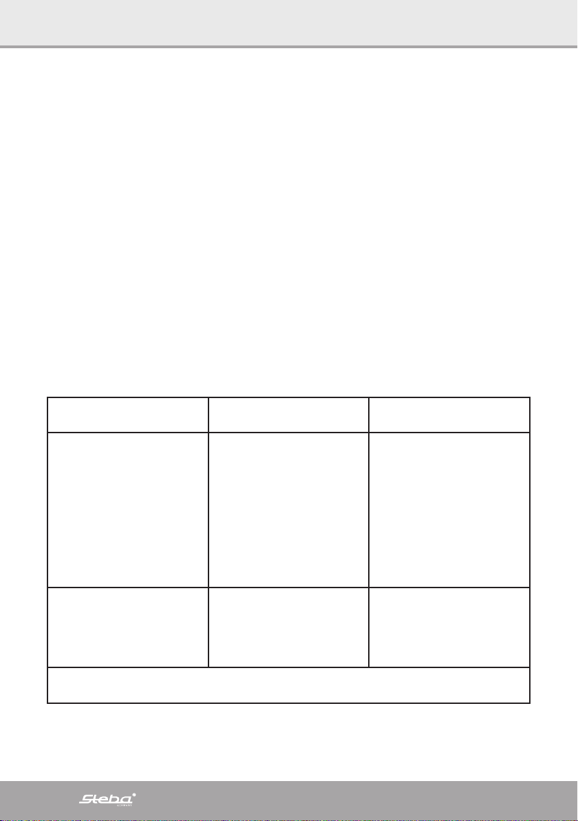∙ Normaler Verschleiß∙ Gebrauchsschäden an der Beschichtung∙ Glasbruch∙ Unsachgemäße Anwendung, wie Überlastung oder nicht zugelassene Zubehörteile∙ Beschädigung durch Fremdeinwirkung, Gewaltanwendung oder Fremdkörper∙ Schaden durch Nichtbeachtung der Gebrauchsanleitung z. B. falsche Netzspannung