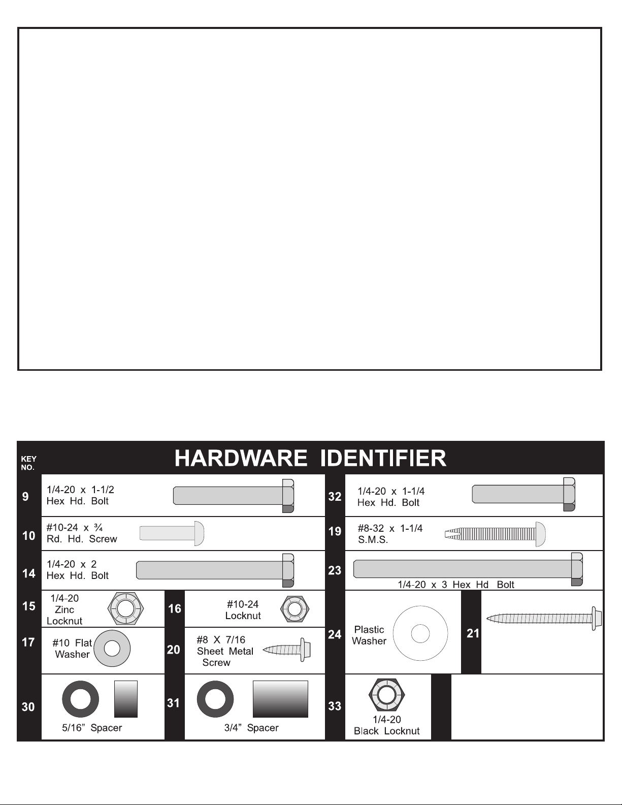 3.To make assembly easier, use the Hardware Identifier on page 9 to identify and sort all