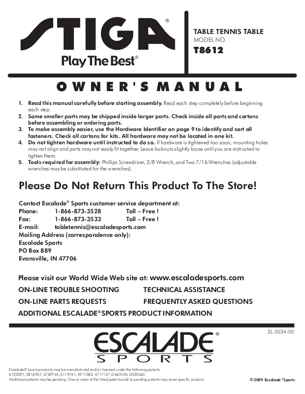 Escalade® Sports products may be manufactured and/or licensed under the following patents.