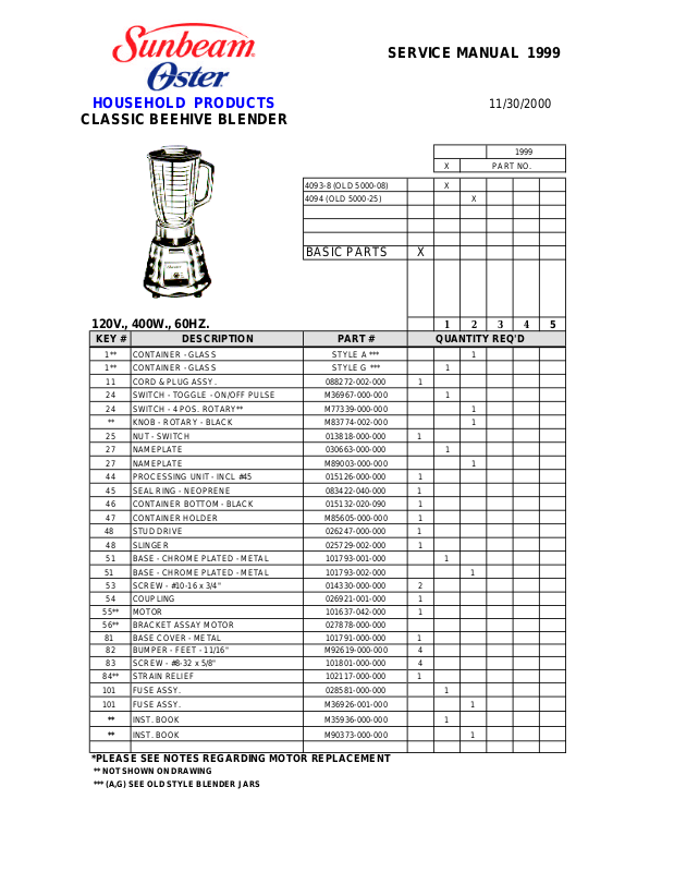 *PLEASE SEE NOTES REGARDING MOTOR REPLACEMENT