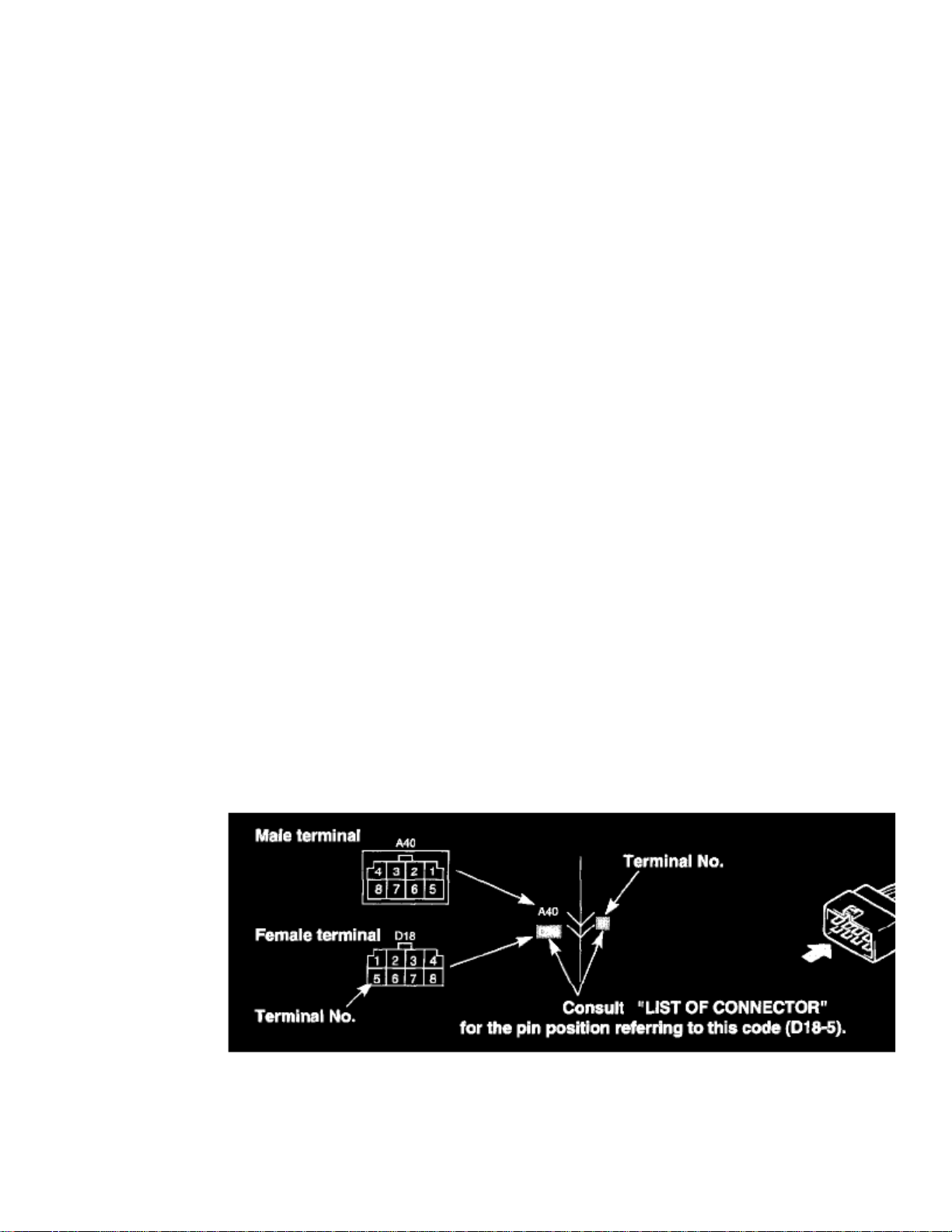 The connectors are indicated as shown below in ("SYSTEM CIRCUIT DIAGRAM"). For the shape and pin arrangement of each connector used, referto ("LIST OF CONNECTORS"). Described below are how they are indicated and how to read them