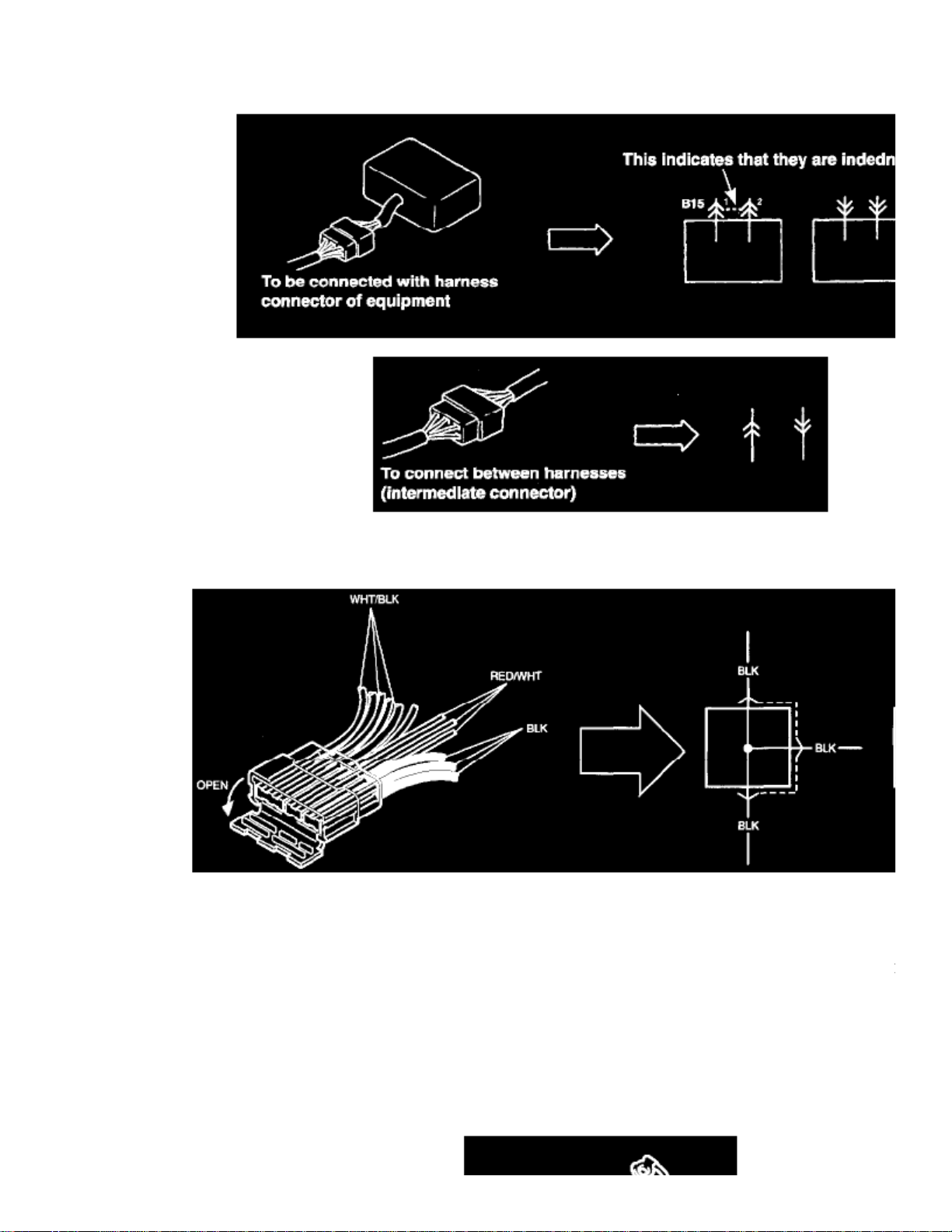 The intermediate connector which connects harnesses is shown by both shapes of the male terminal and the female terminal but the connector to beconnected directly to the equipment is shown by the shape of the connector on the harness side.- The connectors described are always "harness side connectors" which are viewed from the direction as shown at the right.