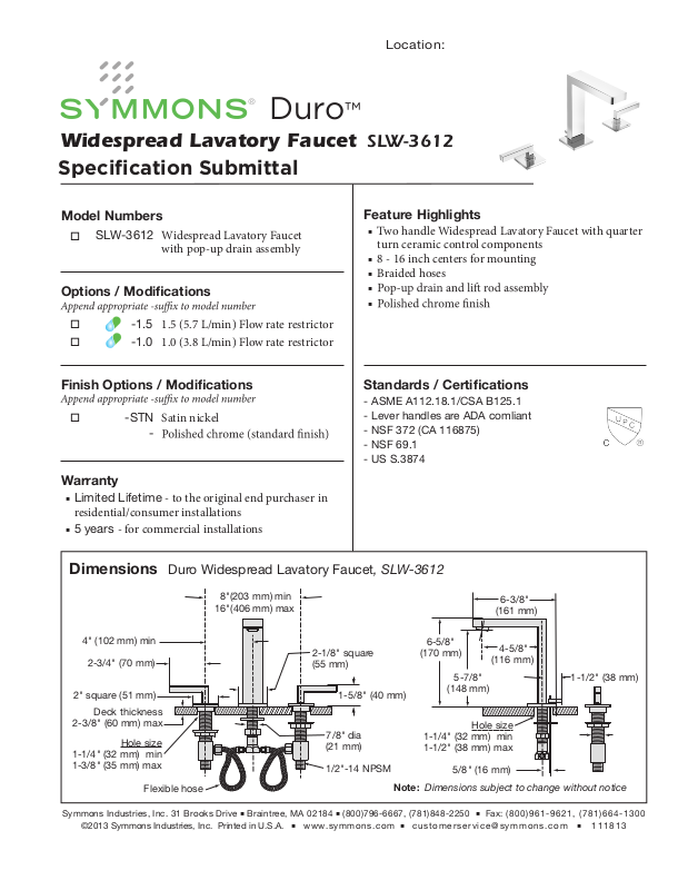 ©2013 Symmons Industries, Inc. Printed in U.S.A. ■ www.symmons. com ■ cus tom erser vice@s y m mons.com ■ 111813