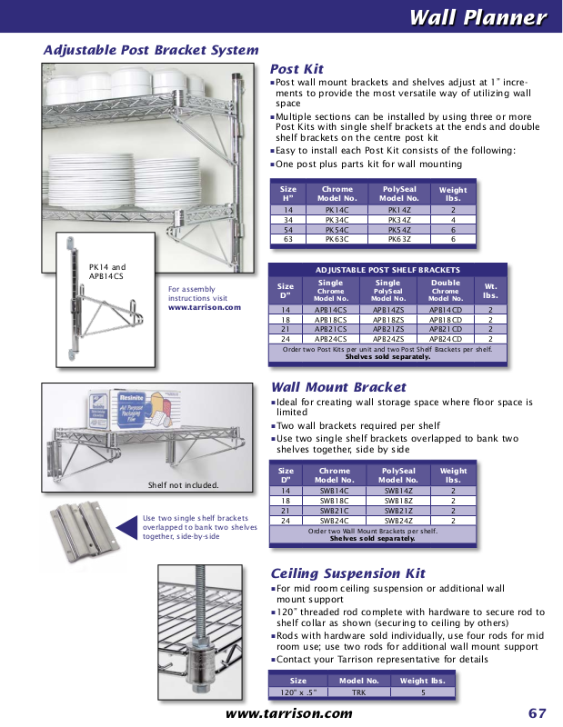 •Post wall mount brackets and shelves adjust at 1” incre-