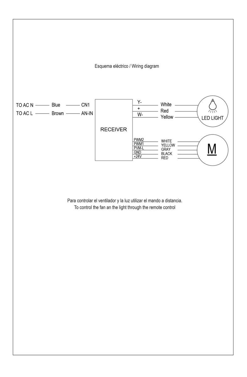 La luz del ventilador se puede conectar de dos maneras. Una forma es controlar el ventilador y la luz a través del control remoto (Ver diagrama de cableado). La otra es controlar la luz a través del interruptor de pared y el ventilador a través del control remoto. Este cambio debe ser realizado por un electricista autorizado.