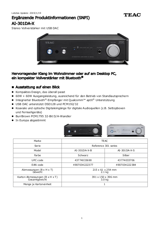 Bitte überprüfen Sie die neuesten Informationen auf: https://teac.jp/int/product/ai-301da/spec