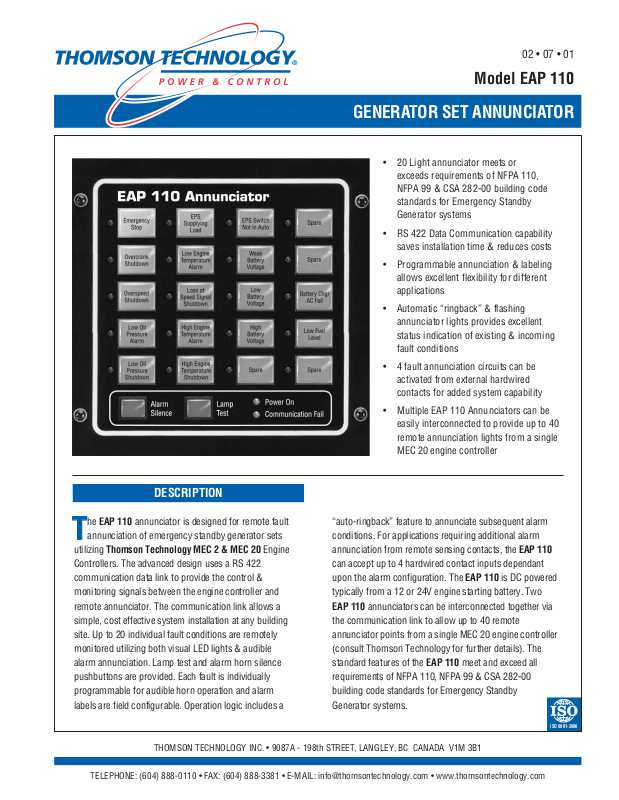 are applied to meet NFPA 110 Level 1/NFPA 99 or CSA 282 alarm requirements. The standard EAP 110 can be labeled and