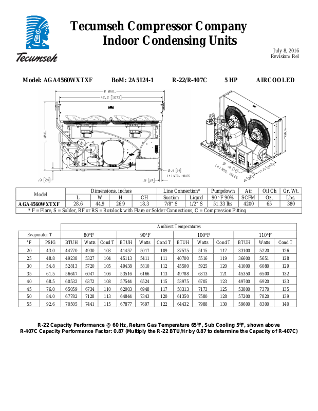 Model: AGA4560WXTXF BoM: 2A5124-1 R-22/R-407C 5 HP AIRCOOLED