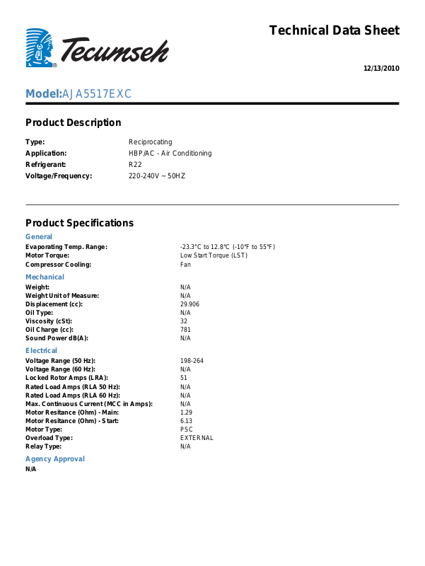 Rated Load Amps (RLA 60 Hz): N/A