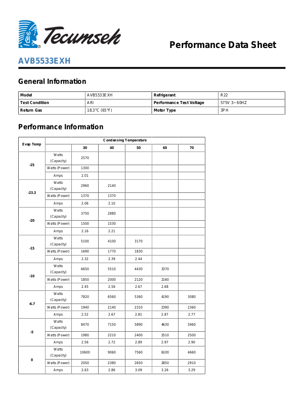Test Condition ARI Performance Test Voltage 575V 3~ 60HZ