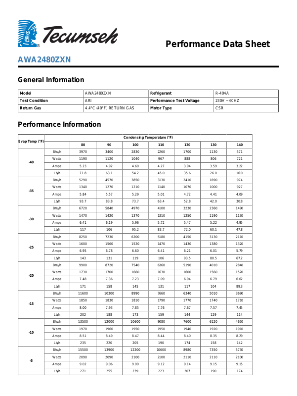 Return Gas 4.4°C (40°F) RETURN GAS Motor Type CSR