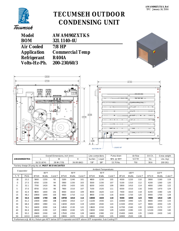 Performance @ 60 Hz, Return gas 40oF below 20oF Evaporator and 65oF above 20oF evaporator, Sub Cooling 5oF