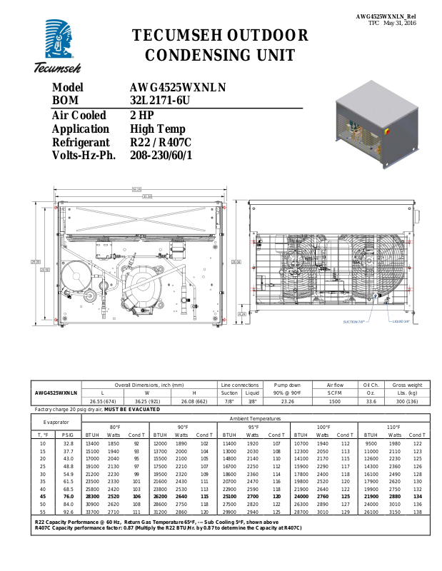 R407C Capacity performance factor: 0.87 (Multiply the R22 BTU/Hr. by 0.87 to determine the Capacity at R407C)