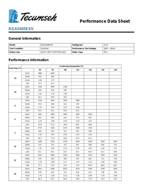 Test Condition ASHRAE Performance Test Voltage 265V ~ 60HZ