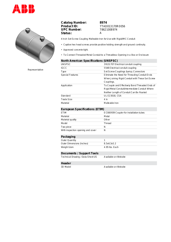 4 Inch Set Screw Coupling Malleable Iron for Use with Rigid/IMC Conduit