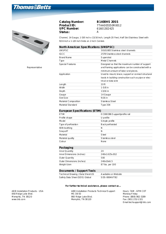 Channel, 14 Gauge, 1-5/8 Inch x 13/16 Inch, Length 20 Feet, Half Slot Stainless Steel with