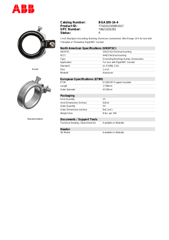 1 Inch Blackjack Grounding Bushing, Aluminum, Galvanized, Wire Range 14 4 for Use with
