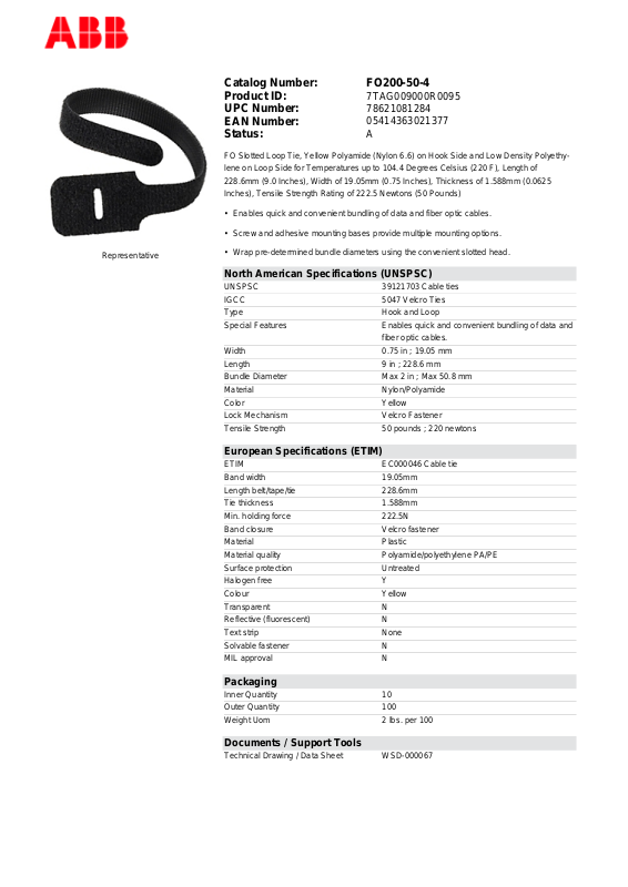 FO Slotted Loop Tie, Yellow Polyamide (Nylon 6.6) on Hook Side and Low Density Polyethylene on Loop Side for Temperatures up to 104.4 Degrees Celsius (220 F), Length of