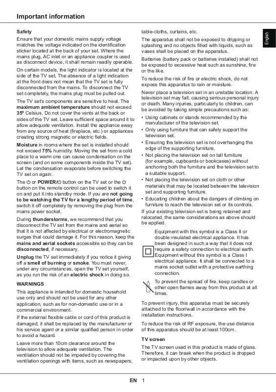 Dust the vents at the back and sides regularly. Using solvents, abrasive or alcohol-based products could damage the TV set. If an object or liquid enters the appliance, unplug it immediately and have it checked by an authorized engineer. Never open the appliance yourself since this may put you at risk or damage the appliance.