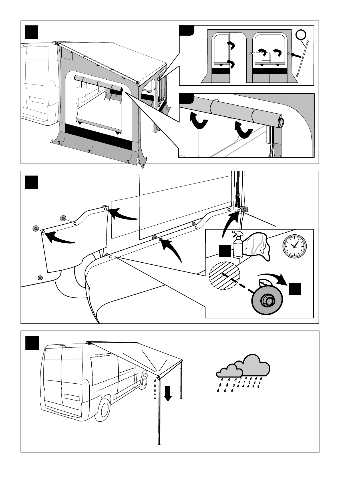 7. When raining, lower one side of the awning so that the water can run down the fabric. Always adjust the support legs with unscrewed