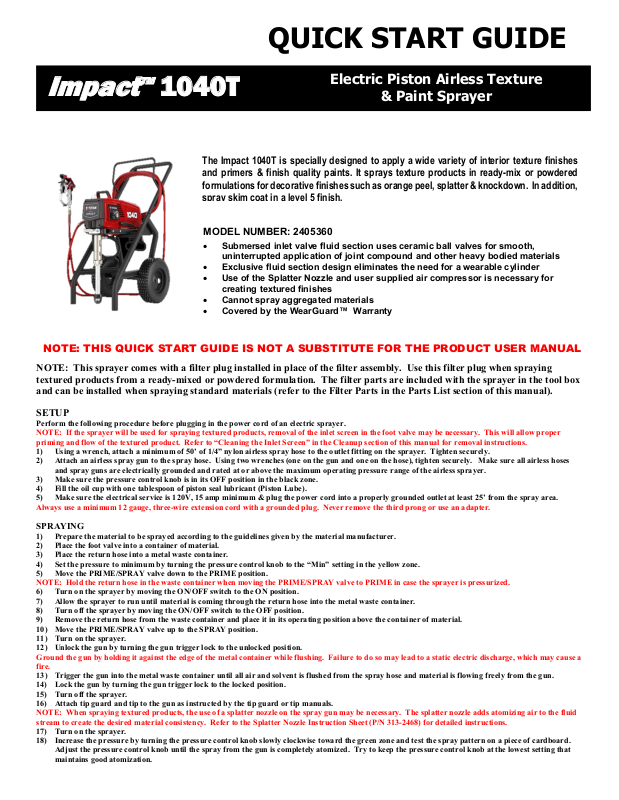 textured products from a ready-mixed or powdered formulation. The filter parts are included with the sprayer in the tool box