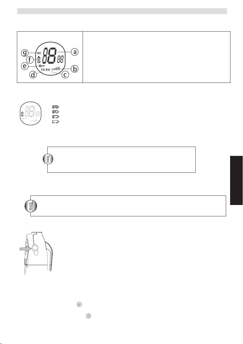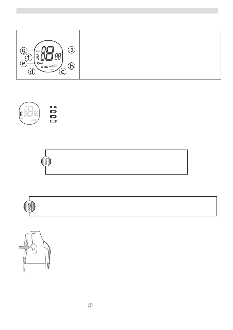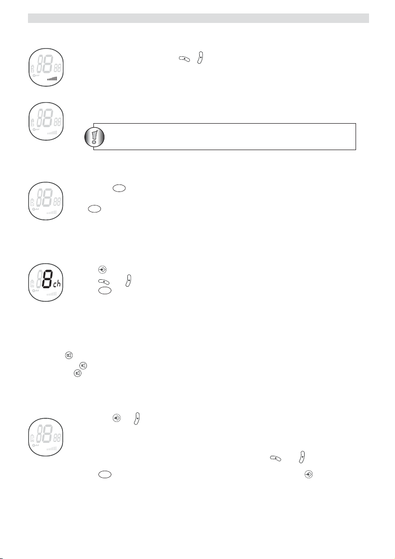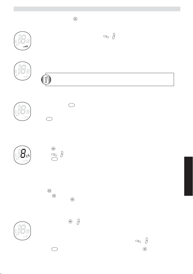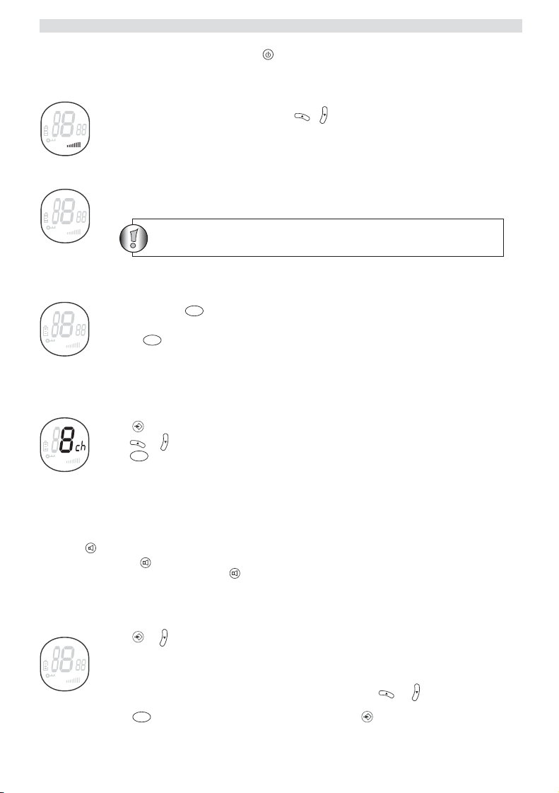 • Bekapcsolás; tartsa lenyomva a -gombot. A készülék hangjelzést ad, majd az LCD kijelzõn megjelenik az aktuális csatorna.