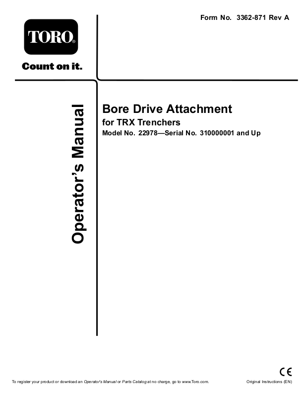 ToregisteryourproductordownloadanOperator'sManualorPartsCatalogatnocharge,gotowww.T oro.com. OriginalInstructions(EN)