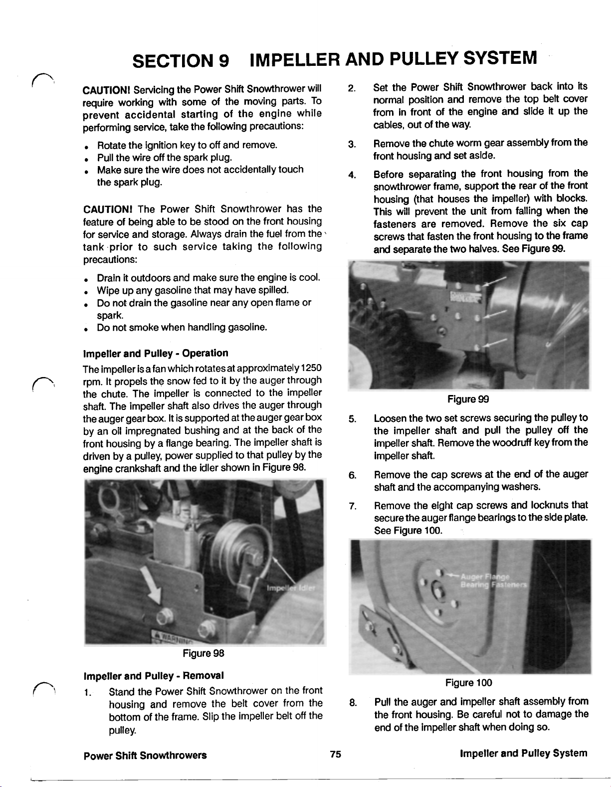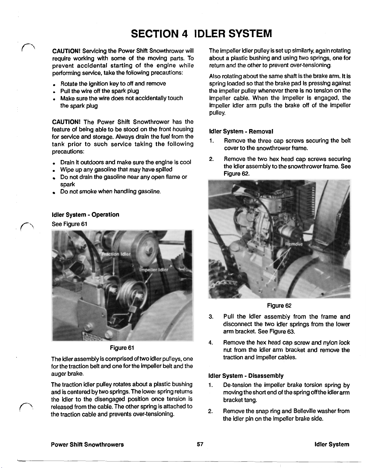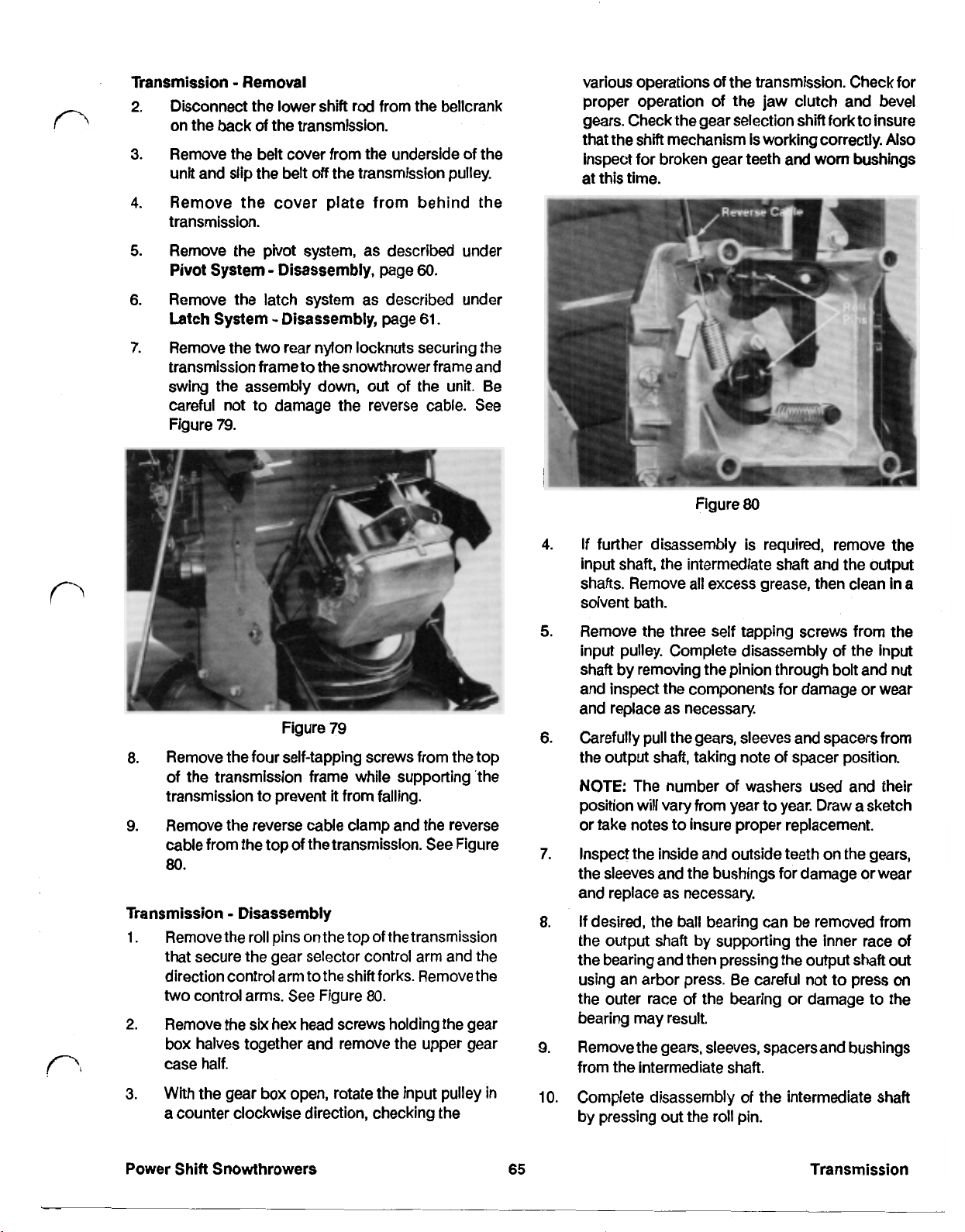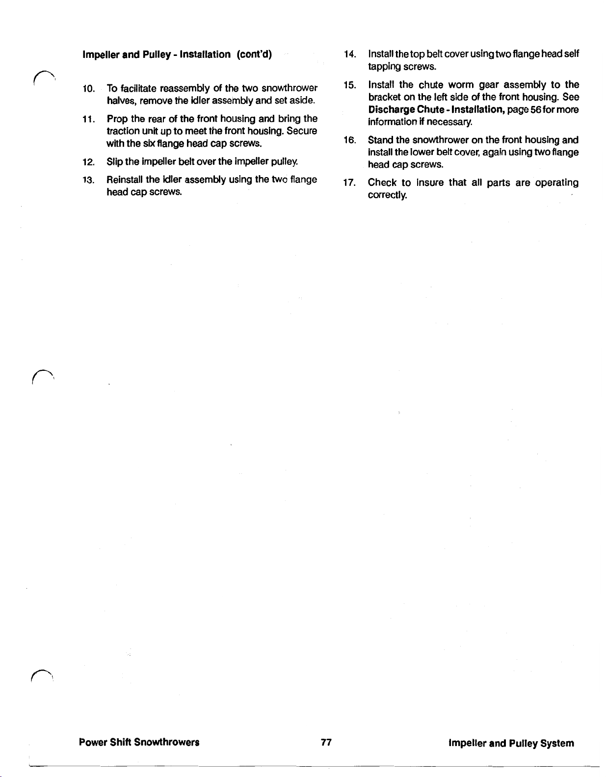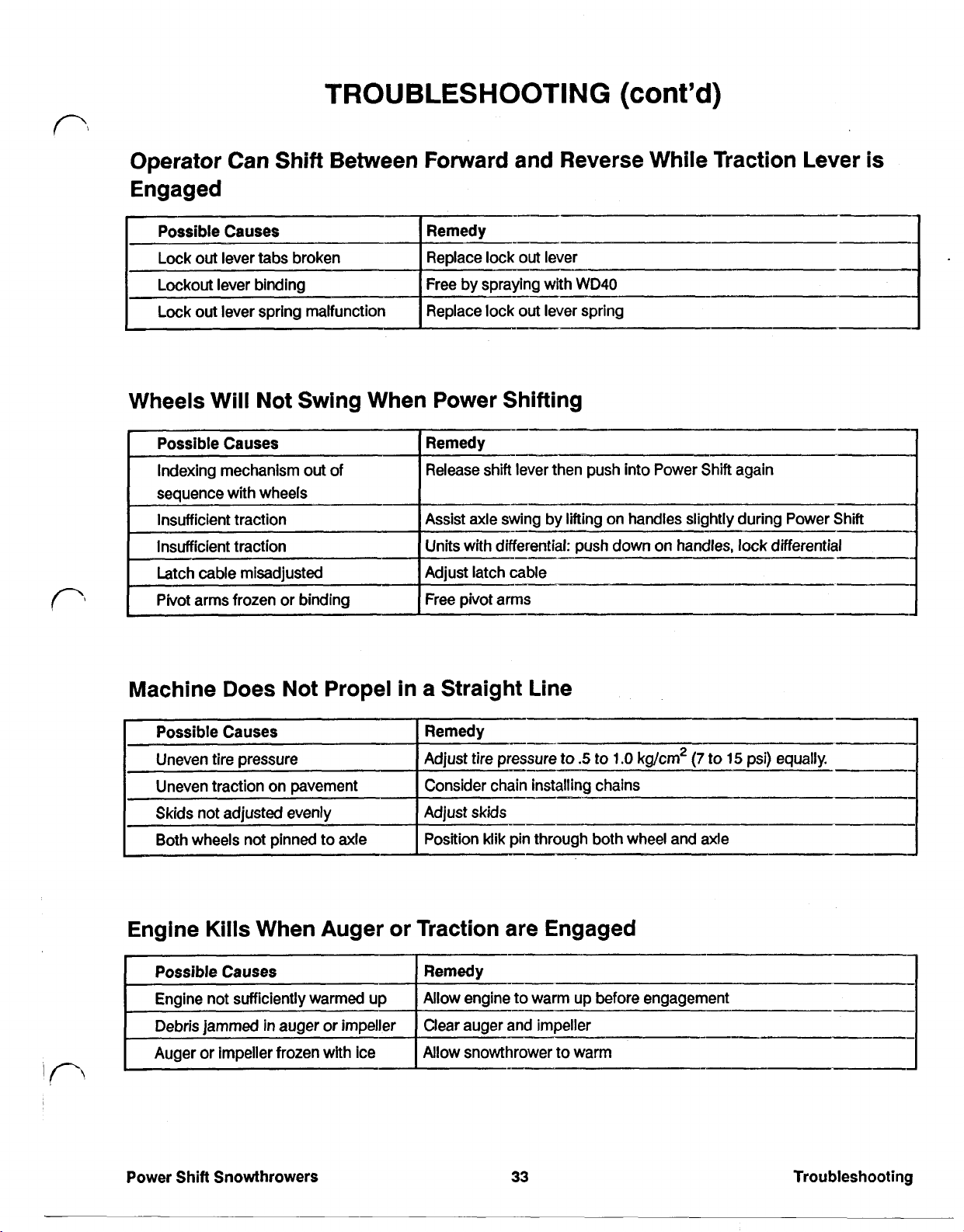 UNIT DOES NOT PROPEL FORWARDUNIT WILL NOT PROPEL BACKWARDNEUTRAL NOT IN CORRECT LOCATIONSHIFT LEVER WILL NOT LOCK IN POWER SHIFT OR REVERSEOPERATOR CAN SHIFT BETWEEN FORWARD AND REVERSE WHILE TRACTION LEVER ISWHEELS WILL NOT SWING WHEN POWER SHIFTINGMACHINE DOES NOT PROPEL IN A STRAIGHT LINEENGINE KILLS WHEN AUGER OR TRACTION ARE ENGAGEDPOOR SNOWTHROW ING PERFORMANC EIMPELLER OR AUGER DOES NOT TURNTRACTION OR IMPELLER DOES NOT DISENGAGECHUTE PLUGS WITH SNOWSCRAPER CATCHES ON UNEVEN PAVEMENTSNOWTHROWER LEAVES SNOW BEHINDRAPID SKID AND SCRAPER W EARFRONT END RISES