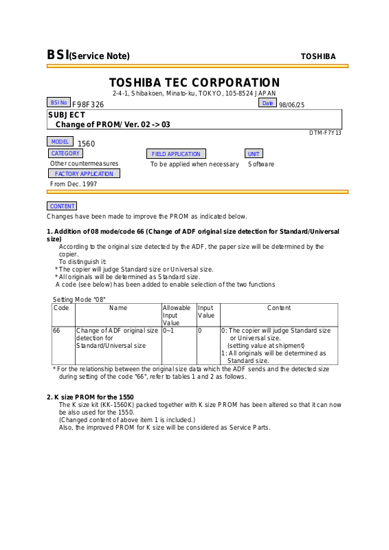 1. Addition of 08 mode/code 66 (Change of ADF original size detection for Standard/Universal