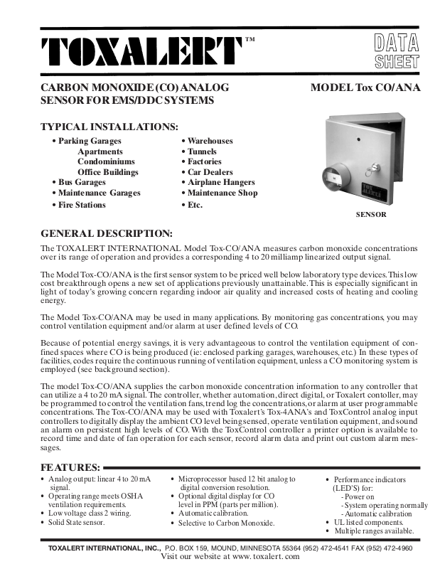 concentrations. The Tox-CO/ANA may be used with Toxalert’s Tox-4ANA’s and ToxControl analog input
