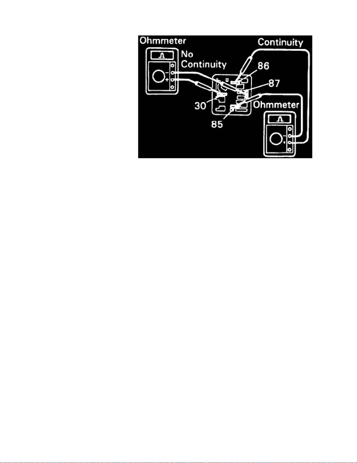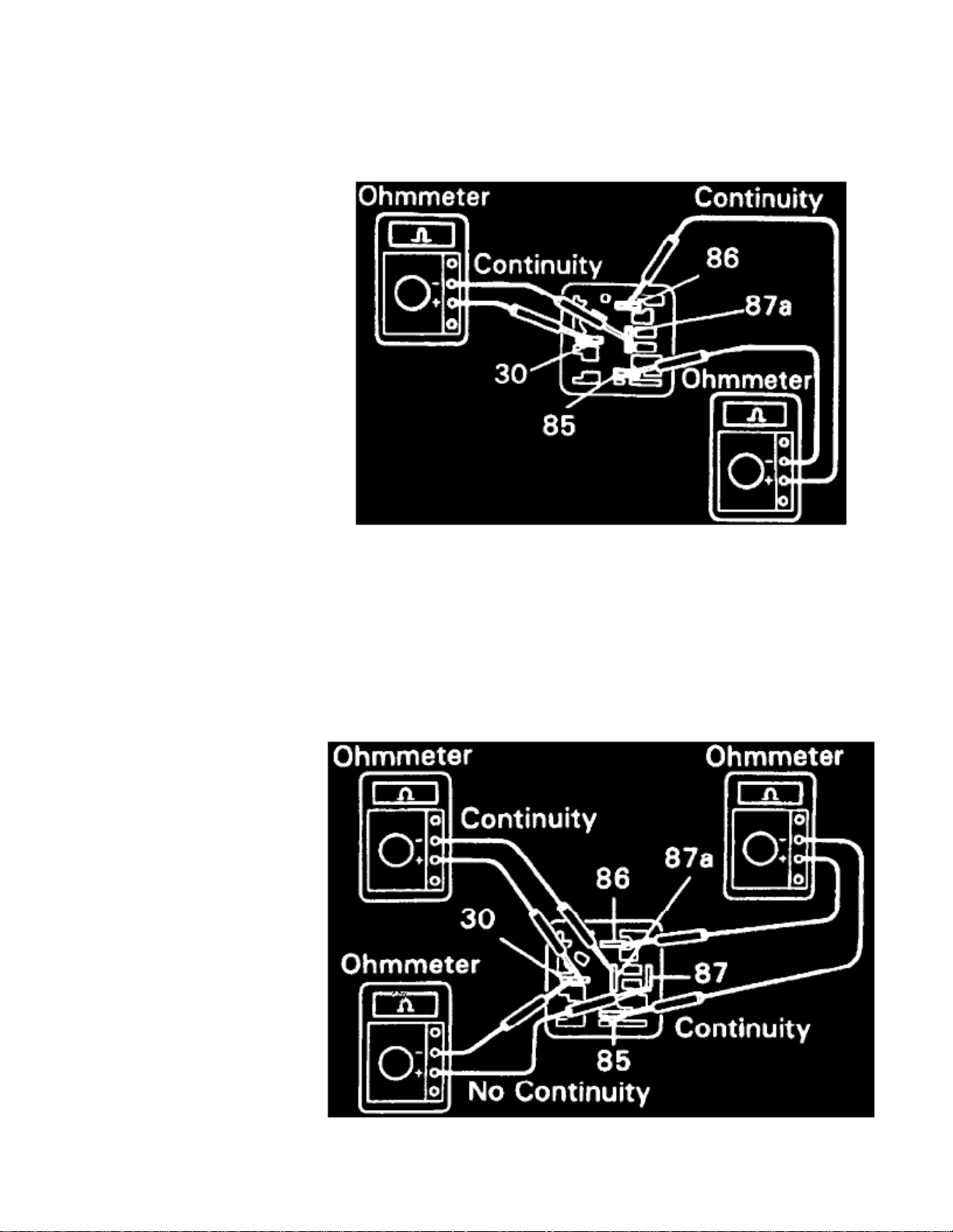 b. Ensure continuity does not exist between terminals 30 and 87.c. Apply battery voltage across terminals 85 and 86.d. Ensure continuity exists between terminals 30 and 87.e. If continuity is not as specified, replace relay.