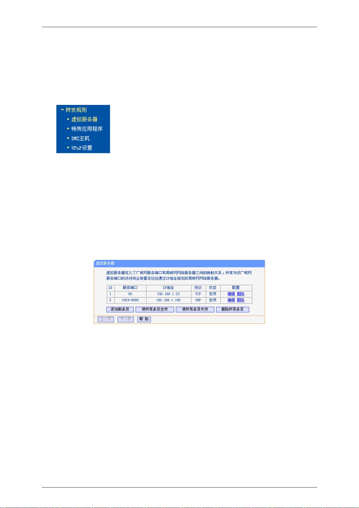 3) 设置虚拟服务器方法:进入管理界面,选择菜单“转发规则”下的“虚拟服务器”,点击“添