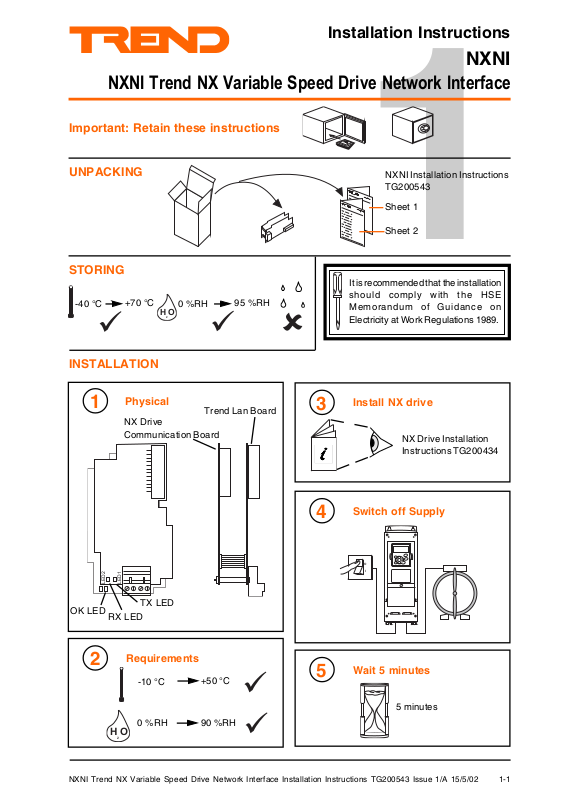 NXNI Trend NX Variable Speed Drive Network Interface Installation Instructions TG200543 Issue 1/A 15/5/02