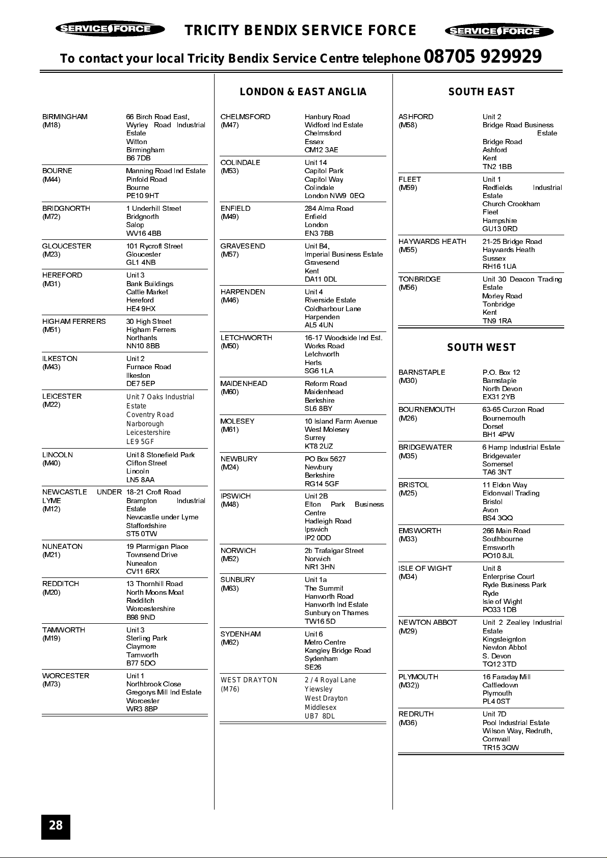 The address of your local Service Force Centre is detailed on the following pages headed Tricity Bendix