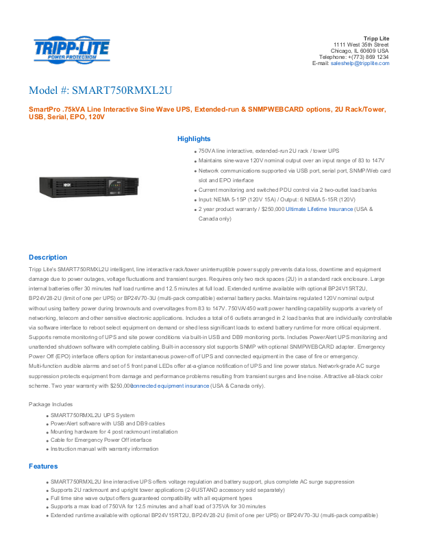 Tripp Lite's SMART750RMXL2U intelligent, line interactive rack/tower uninterruptible power supply prevents data loss, downtime and equipment